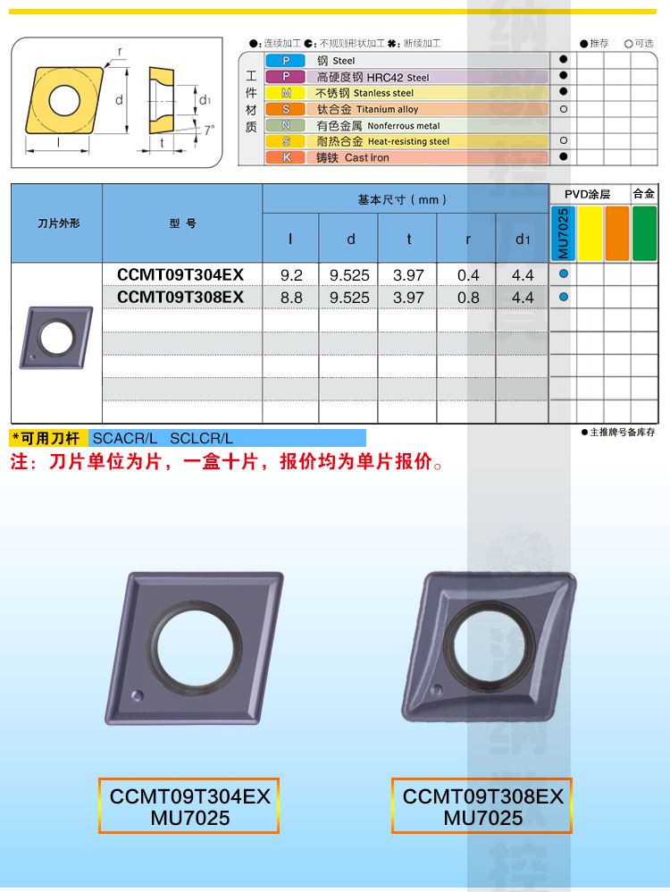 NASKA纳斯卡CCMT09T308EX MU7025钢件专用菱形镗孔数控刀片
