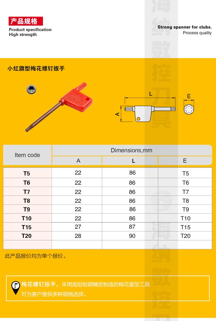 海纳红旗梅花螺钉扳手T5/6/7/8/9/10/15/20数控刀具刀杆刀盘扳手